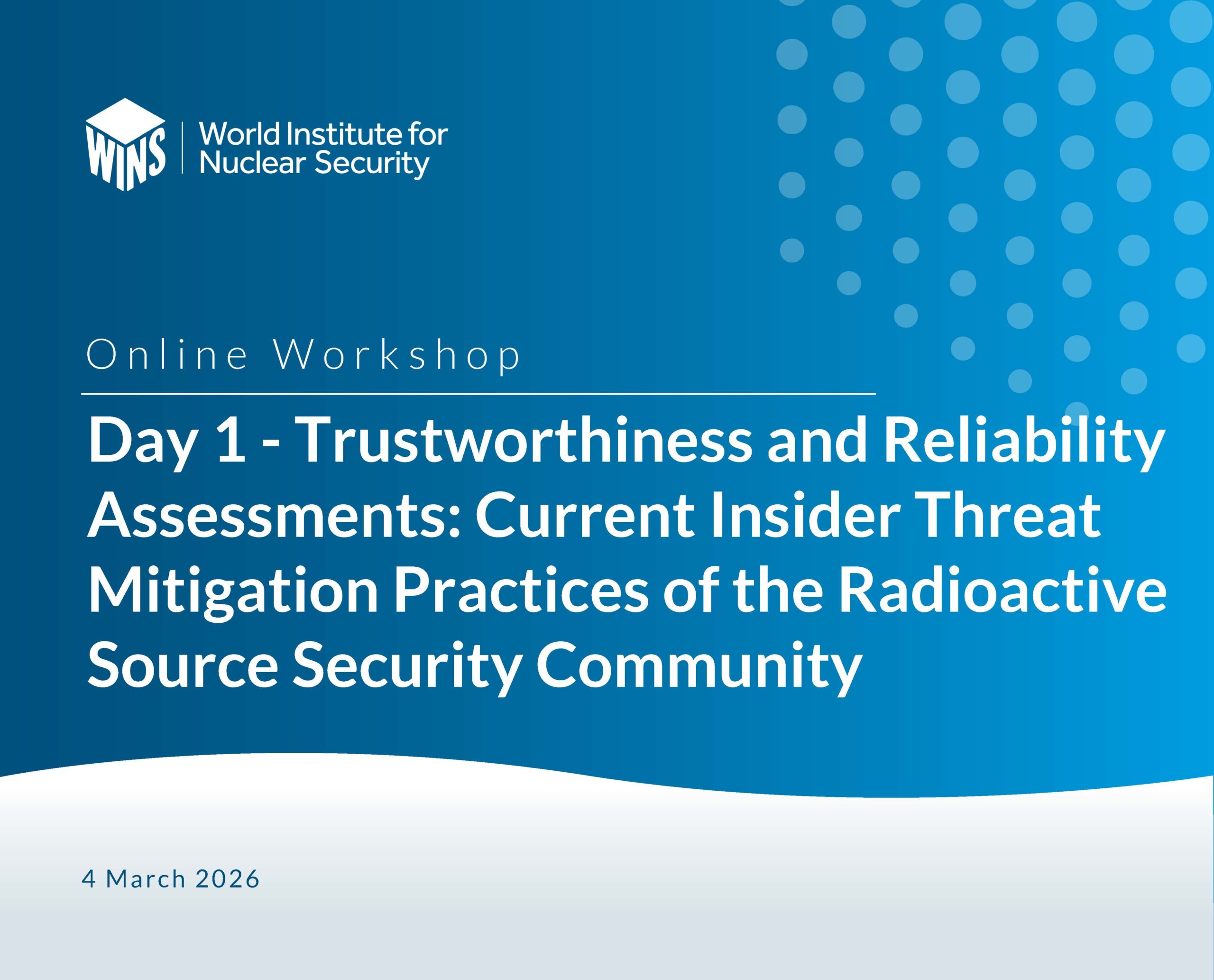 Sign In / Sign UpWINS held an online workshop on the Trustworthiness and Reliability Assessments: Current Insider Threat Mitigation Practices of the Radioactive Source Security Community. Various stakeholders were able to exchange experience and lessons learned about developing and implementing trustworthiness and reliability assessments in the contemporary workplace. The online workshop: